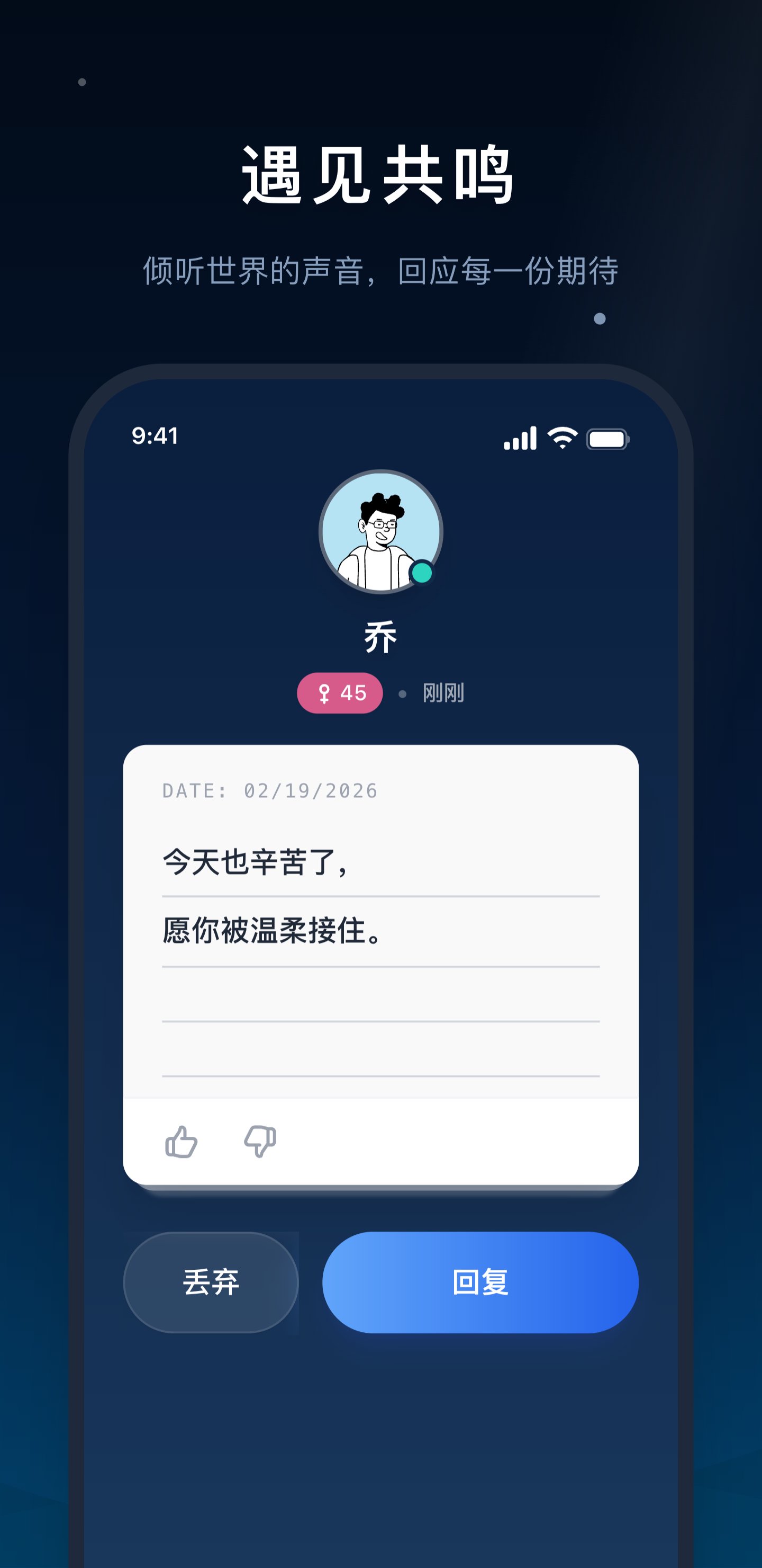 【深い共鳴】単なるテキストベースのコミュニケーションではなく、魂のぶつかり合いです。関心タグや感情マッチングを通して、最も必要な時に、いつでも温かい声があなたのそばに届きます。