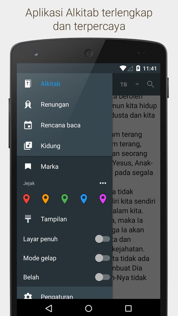 Alkitab Bahasa Melayu, datang daripada pembangun Yuku, sedang berjalan pada sistem Android pada masa lalu.