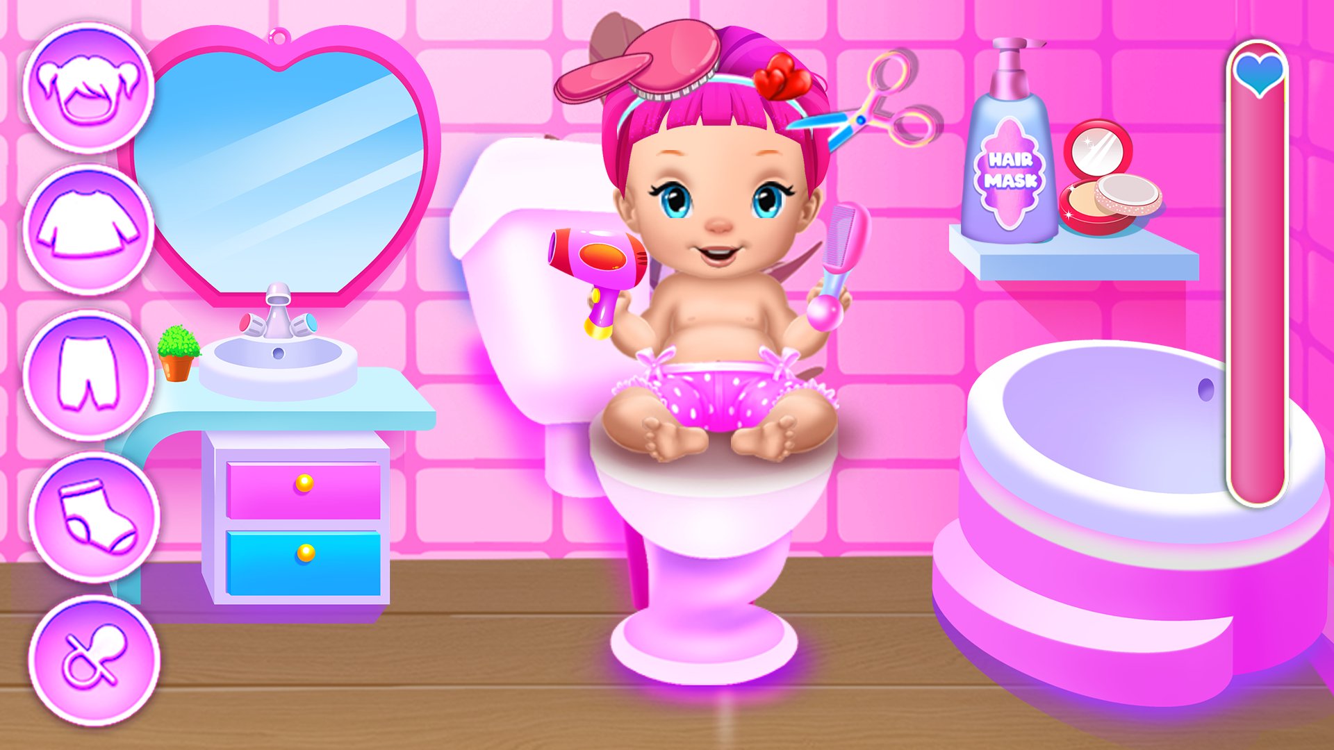 If you thought that being a baby is hard, then try to be an adult for few minutes and see how it's like to take care of a little girl in this virtual parenting challenge. You will get through 4 major steps that will gently introduce you to the right way a baby should be taking care of. Also, you will have a permanent guide during this baby game because each task will be followed by instructions and it's actually easier than in real life because the baby will show you exactly what she will need and when you just have to pay attention. As you can see in the imaginary bubble of thoughts Bella wants to go to the bedroom where you will need to change her diaper with a fresh one, then you will check her temperature to see if she feels ok. Apply that medicinal mixture on the bumps to make them disappear and right after you have to turn the light on to put her to sleep. After the napping time is over she might ask you food, take her in the kitchen and feed her. You could even buy another type of food from the store if you like to change the menu. Now that she is full she might ask you to take her to the potty chair so she can use it. Last but not least is the dressing up the part where you put on nice piece of clothing appropriate for Bella, change her haircut, maybe add some nice accessories. Play with colors and textures and you will see what a beautiful outfit you can create.