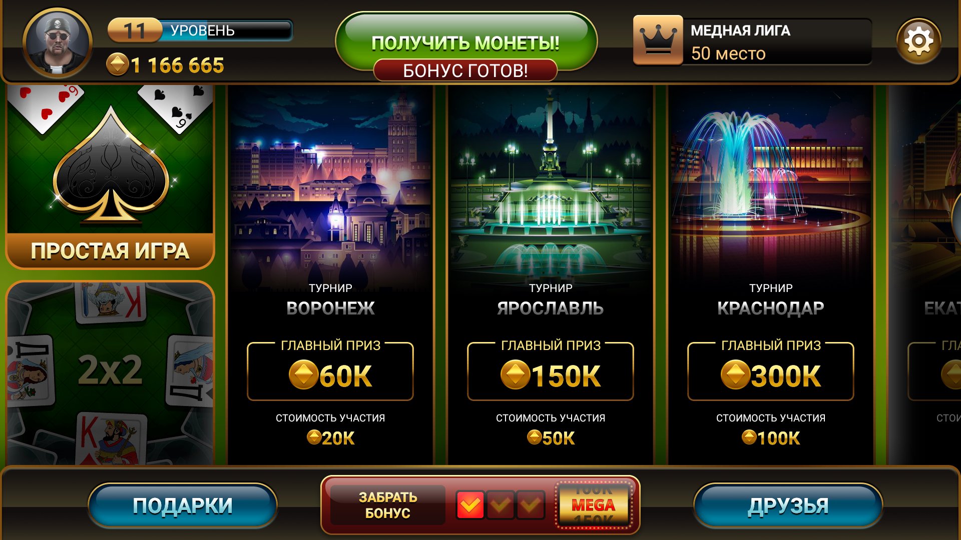 Пройдите турнирную карьеру в самой популярной русской карточной игре по городам России: Воронеж, Краснодар, Екатеринбург, Ростов, Петербург и др. Выиграйте кубки всех городов и станьте Чемпионом!