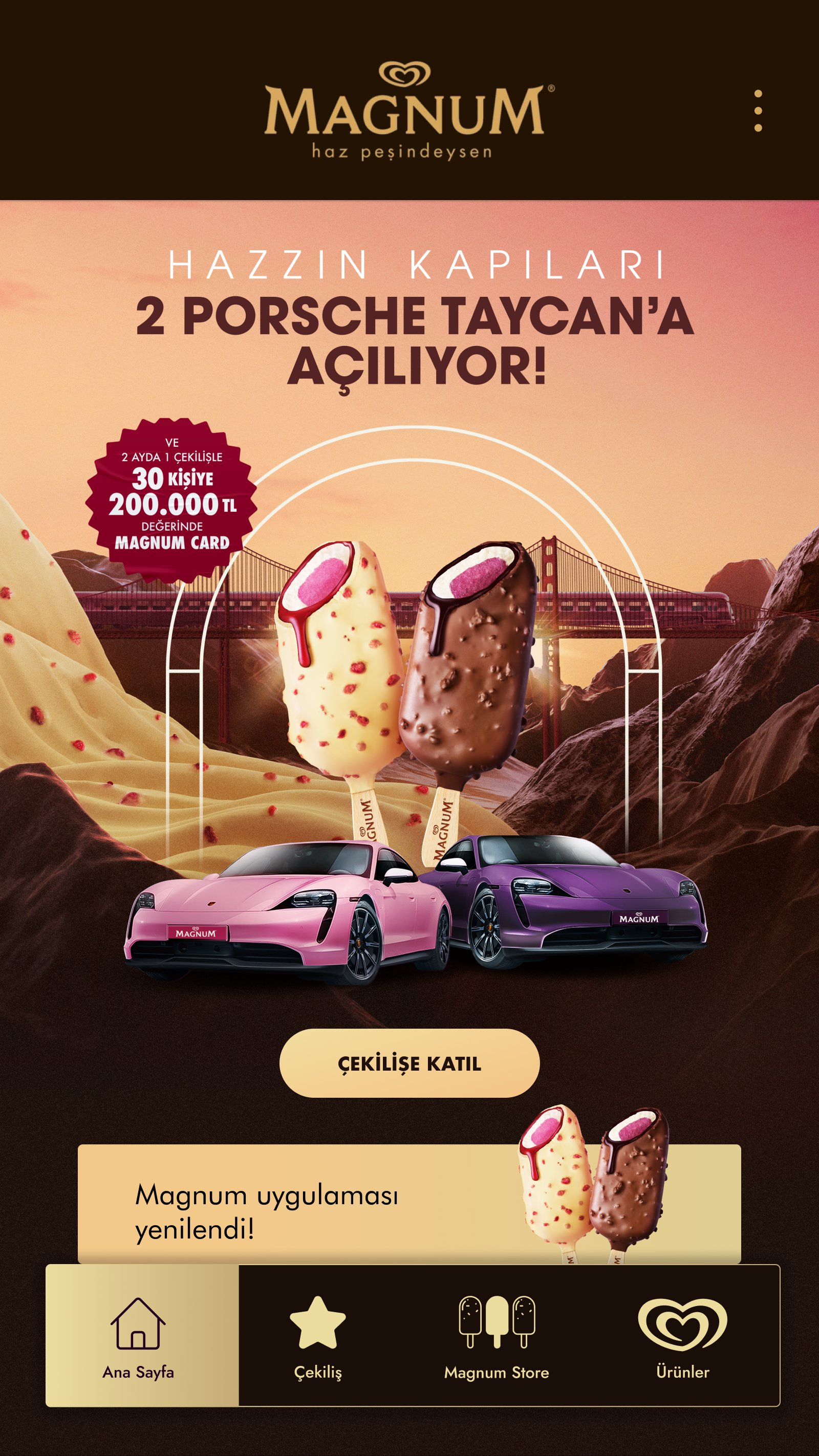 Yenilenen Magnum uygulamasıyla Magnum çekiliş kampanyasına katılabilir, kazanma şansınızı artırabilirsiniz.